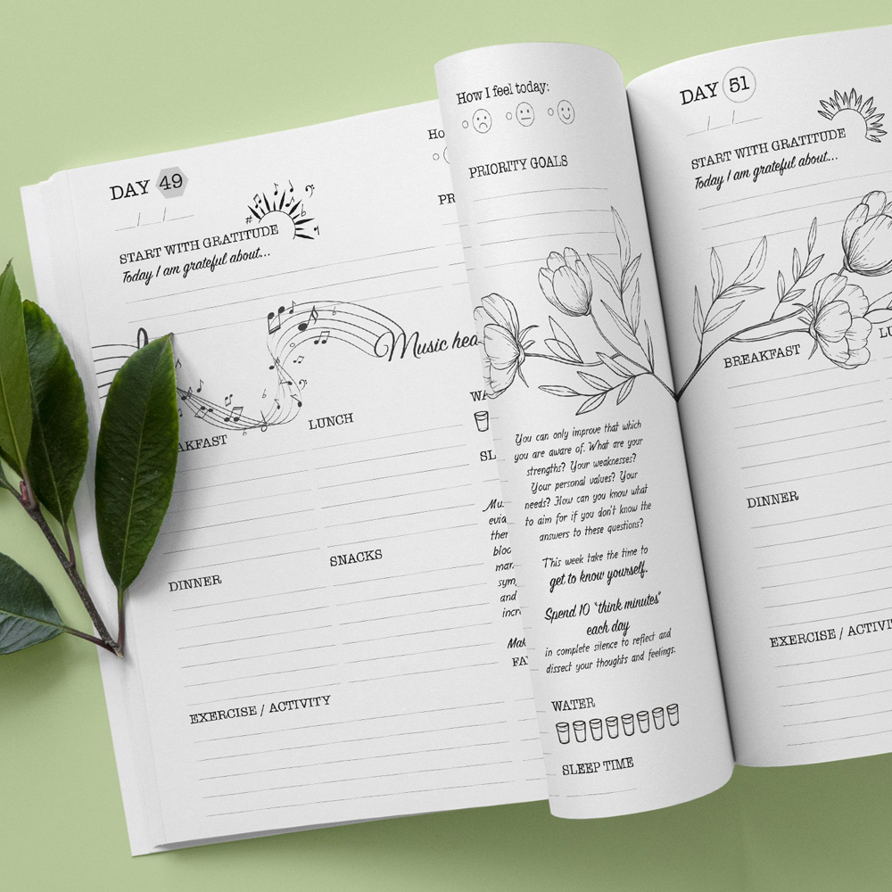 Each day, you'll be greeted with thought-provoking prompts, practical tips, and advice aimed at enhancing mindfulness, self-love and confidence. Each day it will guide you in nurturing your physical, emotional, and mental well-being.